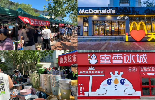 此外,为全面提升校园生活品质,迎接新学期的到来,校园商贸在暑期实现了全面升级。假期期间,多家校内门店启动了装修改造工程,以明亮整洁的环境焕新亮相,为同学们营造更加舒适、现代的购物氛围。备受同学们喜爱的麦当劳、蜜雪冰城等知名品牌也首次正式入驻校园,不仅为广大师生带来了更多元、便捷的餐饮选择,也为校园商业生态注入了全新的活力。为满足新生入学后的日常所需,集百生活超市、物美超市特别在迎新期间开设了室外便利卖场,提前精心备足了床品、洗漱用品、文具等各类生活必需品,并以优惠的价格和集中的陈列,为新生及家长提供了便捷的购物体验。