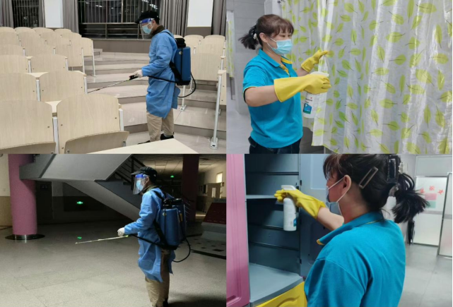 切实保障校园稳定、守护师生健康,后勤管理处开展了全覆盖、无盲区的专项消杀整治工作。在餐饮保障方面,严格执行高标准卫生管理。后厨区域内,对操作台和厨具进行高温灭菌,并对冷库加强通风与除湿处理;就餐区域严格执行每日三次消毒,覆盖餐桌、椅及地面。教学楼方面,提前开窗通风并进行深度保洁,对走廊、楼梯、电梯等公共区域开展消杀工作。同时,针对全校公共浴室展开清理,重点关注瓷砖缝隙、地漏等卫生死角,并进行彻底消杀,全力为新生营造安全、整洁的沐浴环境。