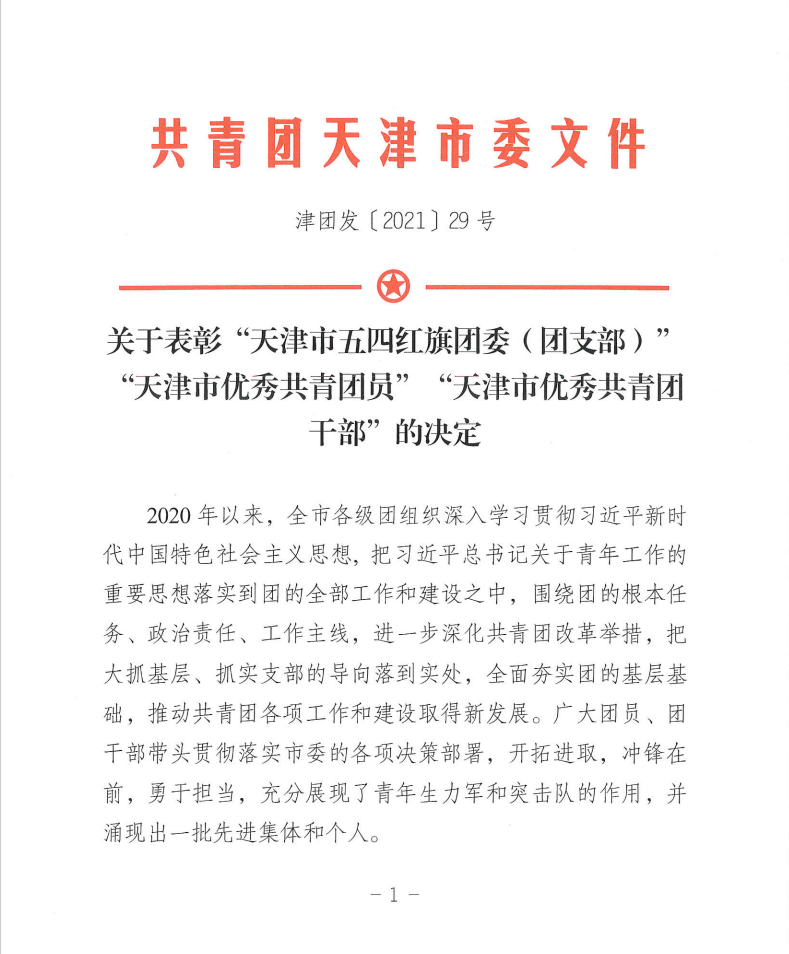 近日,团市委发布了《关于表彰“天津市五四红旗团委(团支部)”“天津市优秀共青团员”“天津市优秀共青团干部”的决定》,旨在表彰先进,树立楷模,鼓舞斗志,激励各级团组织和广大团员、团干部学习先进、奋发有为、攻坚克难,发挥先锋模范作用。我校化学化工学院团委、电气电子工程学院团委、聋人工学院团委、环境科学与安全工程学院团委、海运学院团委共5个学院团委荣获“天津市五四红旗团委”称号,计算机科学与工程学院团委书记尚以迪、材料科学与工程学院团委书记刘欢、语言文化学院团委书记乔丽燕、校团委专职团干部耿苑桃共4名同志荣获“天津市优秀共青团干部”称号。
