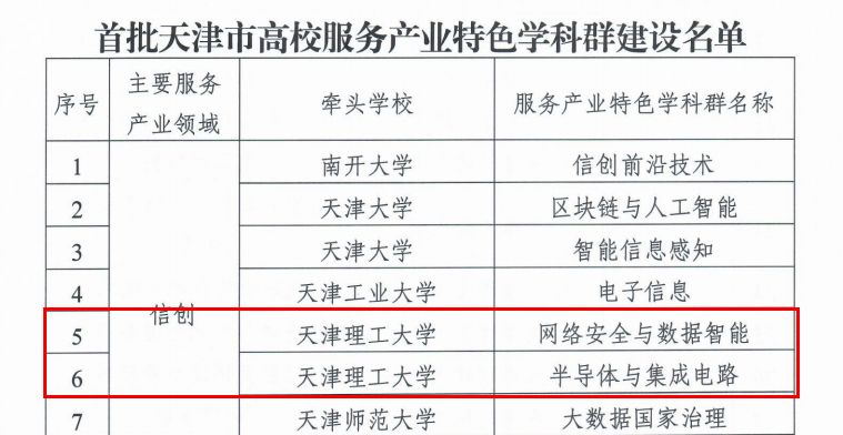 近日,天津市教委印发了《市教委关于公布首批天津市高校服务产业特色学科群建设名单的通知》(津教政办〔2021〕135号),我校网络安全与数据智能、半导体与集成电路、5G+智慧能源互联网、先进动力电池与储能技术等4个学科群入选首批天津市高校服务产业特色学科群建设名单,数量居天津市高校首位。