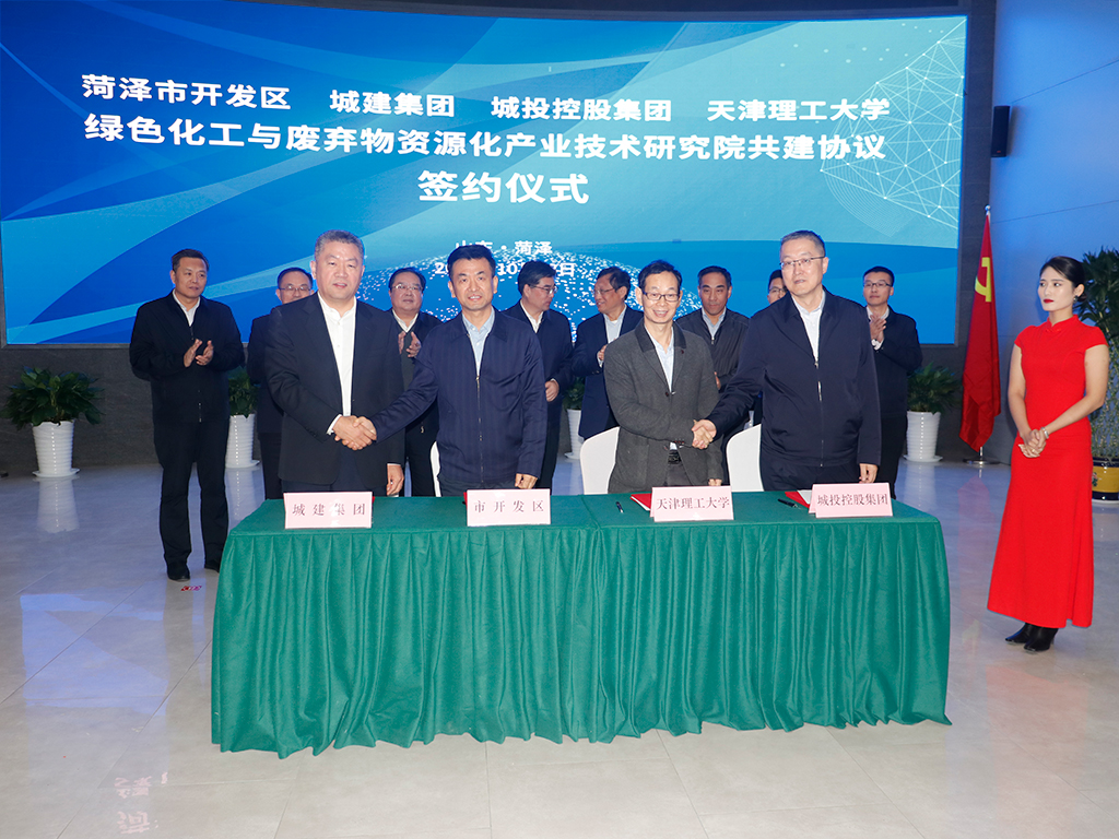 签约仪式上,副校长陈胜勇与菏泽市政府副秘书长刘培廷共同签署校地合作战略协议,与菏泽经济开发区党工委委员、党群工作部主任孔鲁民,菏泽城建集团党委书记、董事长晋卫兵,菏泽城投控股集团党委书记、董事长韩冬共同签署天津理工大学绿色化工与废弃物资源化产业技术研究院共建协议。刘东志与聂元科共同为天津理工大学(菏泽)产业技术研究院揭牌。
