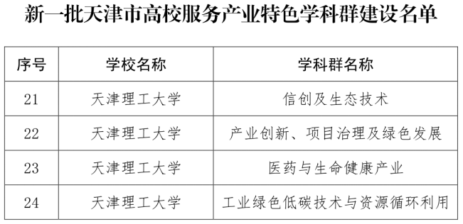近日,市教委印发了《关于公布新一批天津市高校服务产业特色学科群建设名单的通知》(津教研函〔2023〕2号),我校“信创及生态技术”“产业创新、项目治理及绿色发展”“医药与生命健康产业”“工业绿色低碳技术与资源循环利用”等4个学科群入选新一批我市高校服务产业特色学科群建设名单。