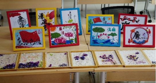 “清”风拂面,“廉”花盛开的DIY纽扣贴画,吸引同学们以纽扣为画笔,展开想象的翅膀,在洁白的卡纸上创作独属于自己心中的“廉”。