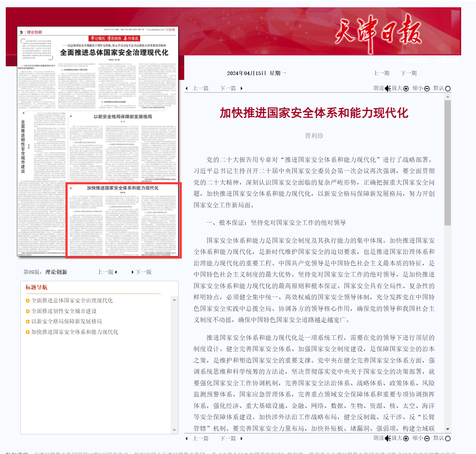《天津日报》——晋利珍:加快推进国家安全体系和能力现代化