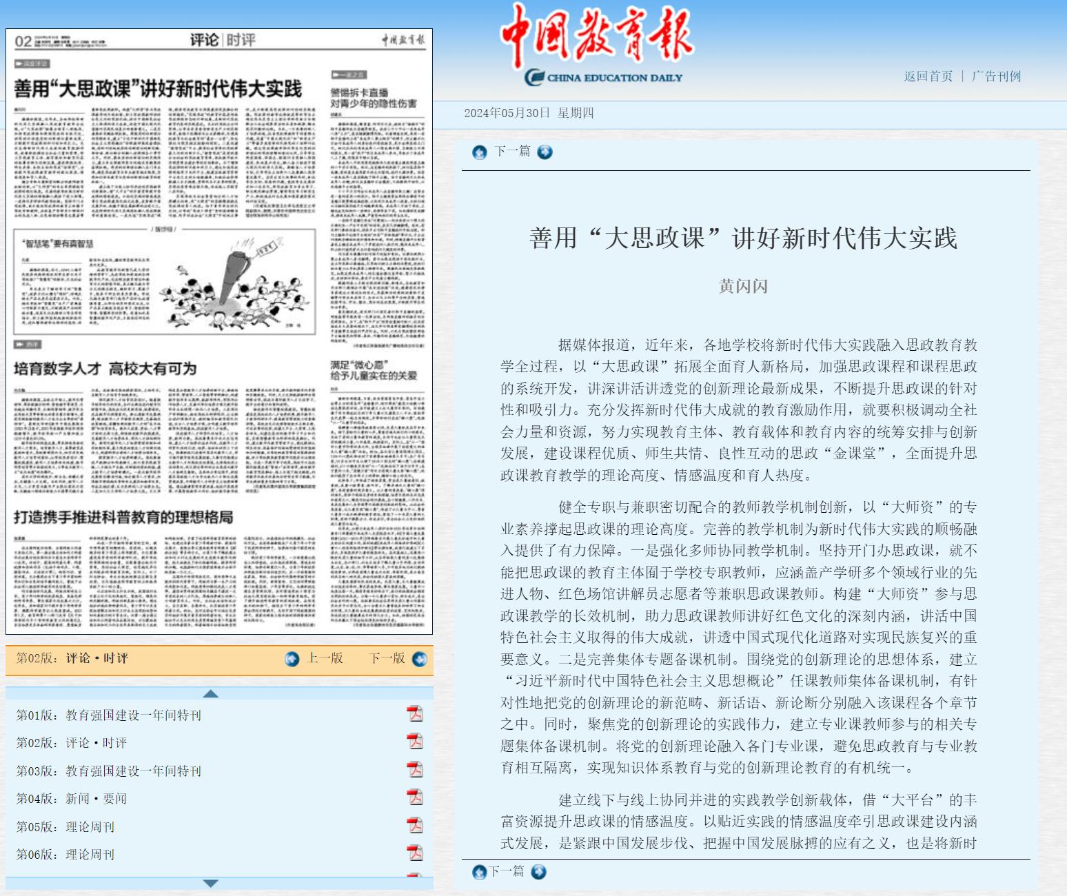 5月30日,《中国教育报》以《善用“大思政课”讲好新时代伟大实践》为题,刊发了我校马克思主义学院教师黄闪闪的理论文章,内容如下:
