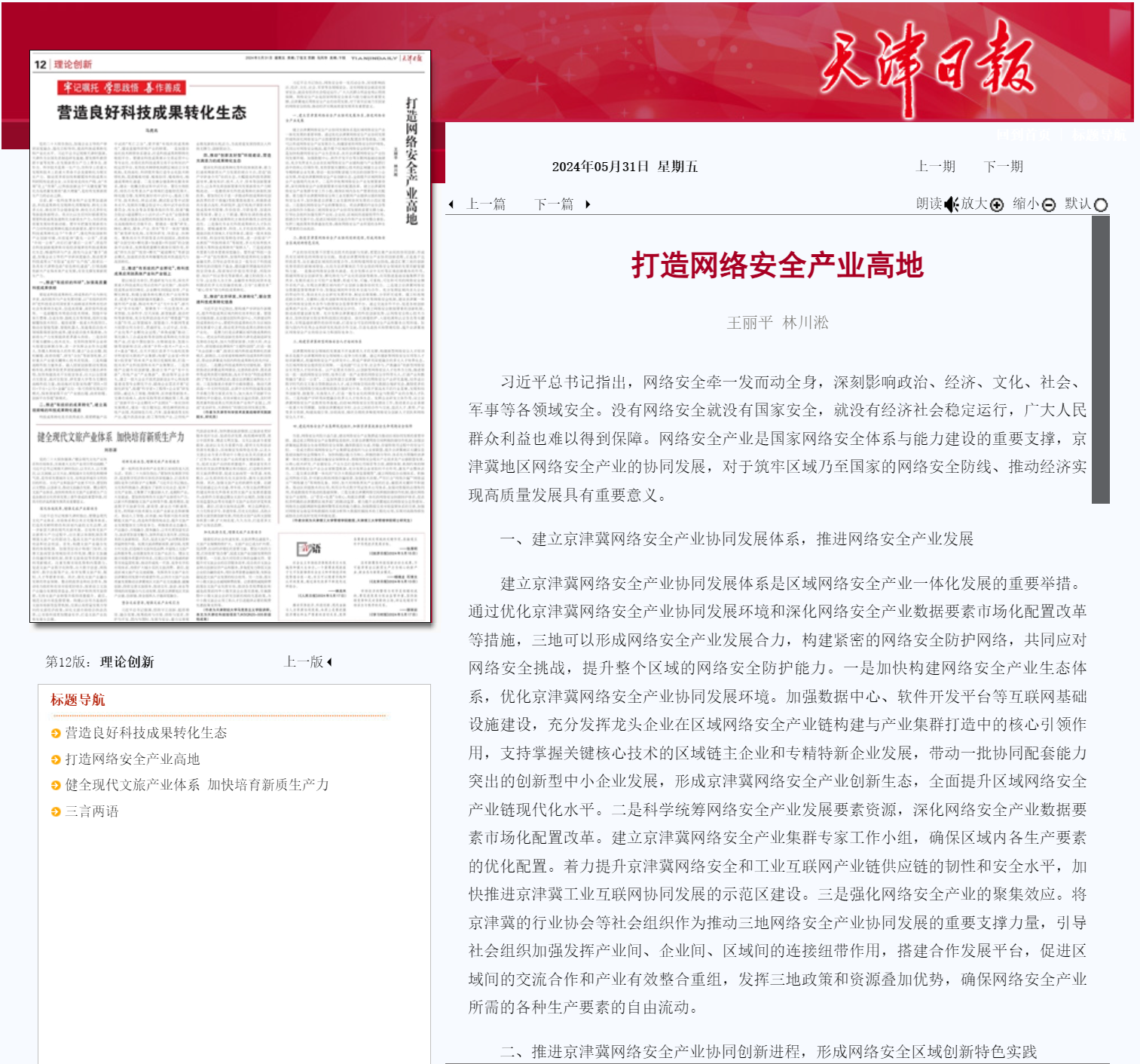 《天津日报》——王丽平 林川淞:打造网络安全产业高地