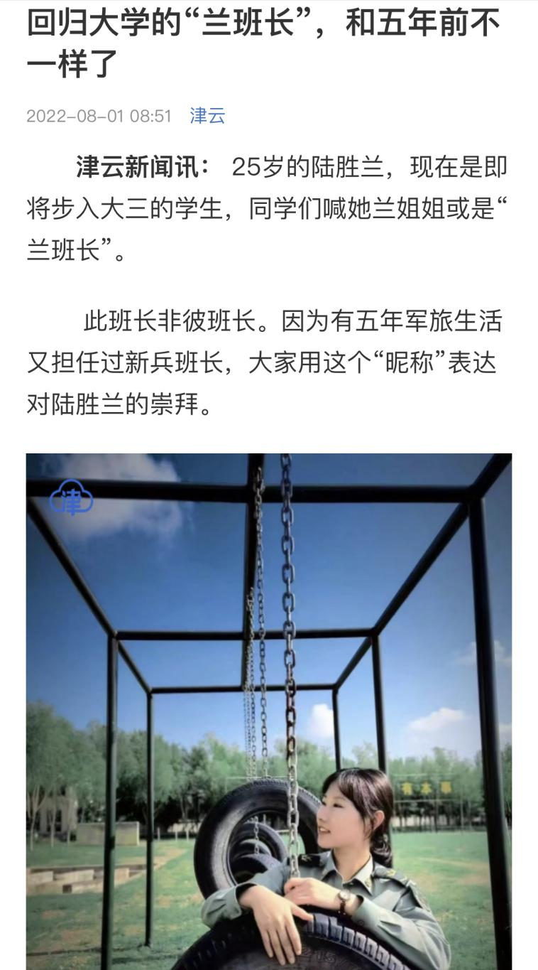 从部队退役回归大学校园后,总有人问陆胜兰:当兵苦不苦、累不累?后悔不?重来一次还会不会这样选择?她就笑答:“如果后悔的话,我怎么会申请延长到五年呢?五年的兵我都没当够!”